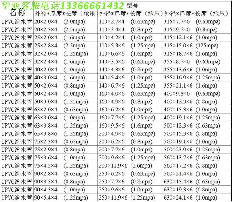 UPVC给水管材对应型号表