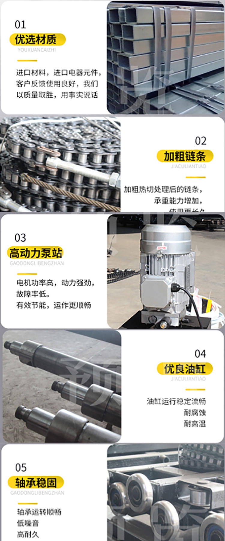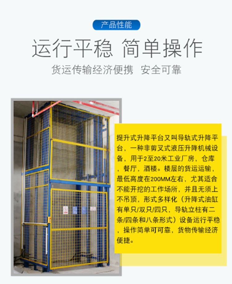 实现多点控制,上下楼层互动联锁,达到安全使用;提升高度高,采用旁置油缸、或双测式油缸,运行平稳、无噪声、维修方便、使用寿命较长;停电手动下降、紧急停止按钮,方便、快捷、实用; 地坑深度一般为15cm-30cm,顶层高度不受限制,可根据现场环境定做用;层门可贯通,厂房内外可相互戳开,方便、节省空间;特别适合2-3层钢结构厂房,内外部均可使用;泵站采用进口泵站,如果速度要求过高,采用进口定制泵站,达到预期的送货要求,油缸和密封件采用进口零部件,解决客户油压不稳定,零部件漏油问题,电器零部件可选。