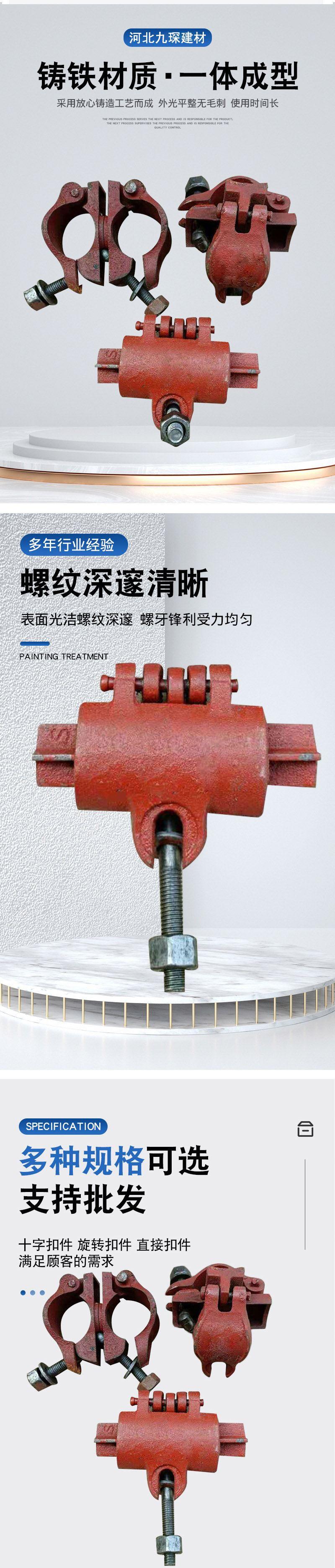 钢扣件一般又分为铸钢扣件和钢板冲压、液压扣件,铸钢扣件的生产工艺与铸铁大致相同,而钢板冲压、液压扣件则是采用3.5-5mm的钢板通过冲压、液压技术压制而成。钢扣件各种性能都比较优越,如抗断性、抗滑性、抗变形、抗脱、抗锈等。目前全国****的铸铁扣件生产厂家集中在河北沧州地区,市场占有率在80%左右;而钢扣件的市场占有率大概在5-10%,主要生产厂家则分布在河北、重庆、新疆等地。
