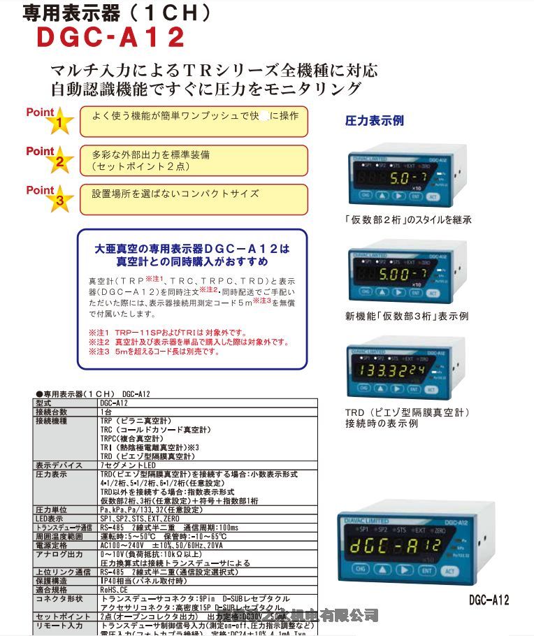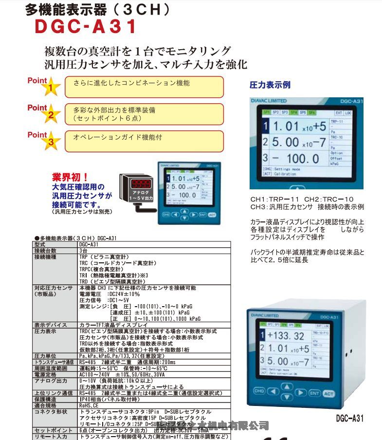 圧力データの監視機能が充実、デジタル通信とアナログ出力を標準装備。