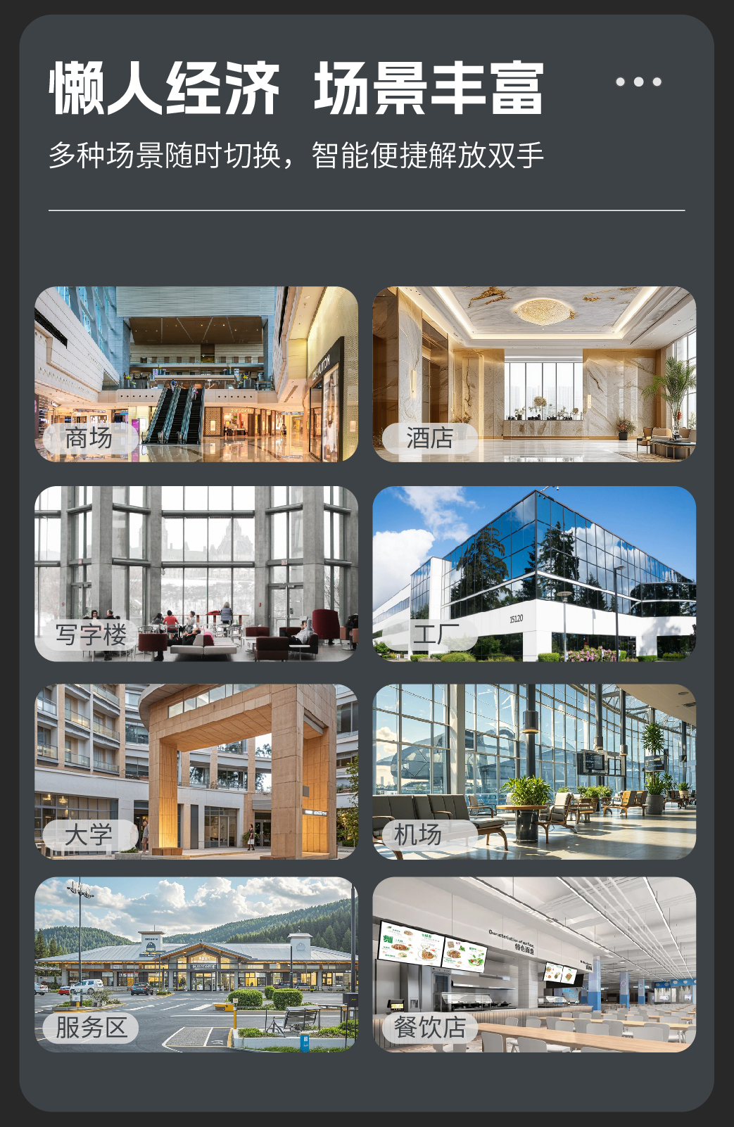 适用范围 | 商场、学校、加油站、充电站、服务区、写字楼、酒店、连锁便利店等 | ||