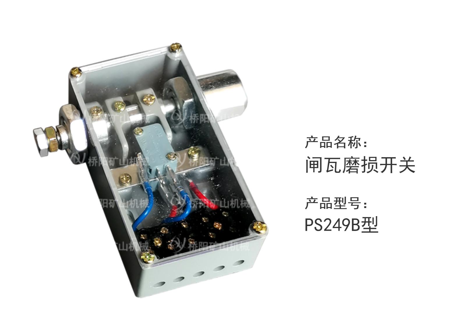产品别名矿井提升机盘形制动器用闸瓦磨损开关,此配件安装设在盘形制动器侧面,是矿用绞车的组成部分,用来闸瓦的磨损程度,绞车的运行。