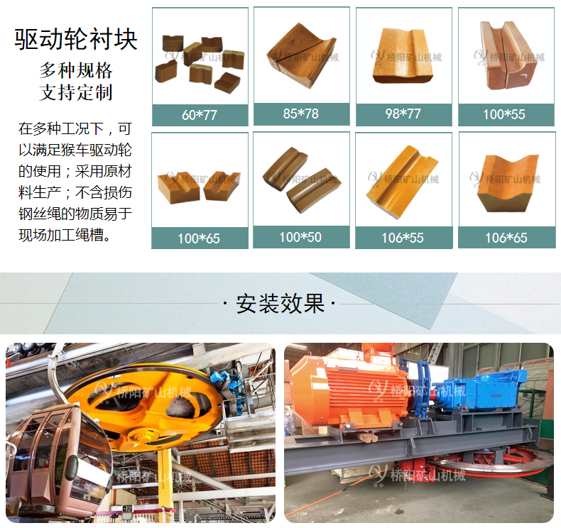 驱动轮衬垫技术特点:在各种工况下,可以满足猴车驱动轮的使用要求;采用原材料生产;不含损伤钢丝绳的物质,易于现场加工绳槽。