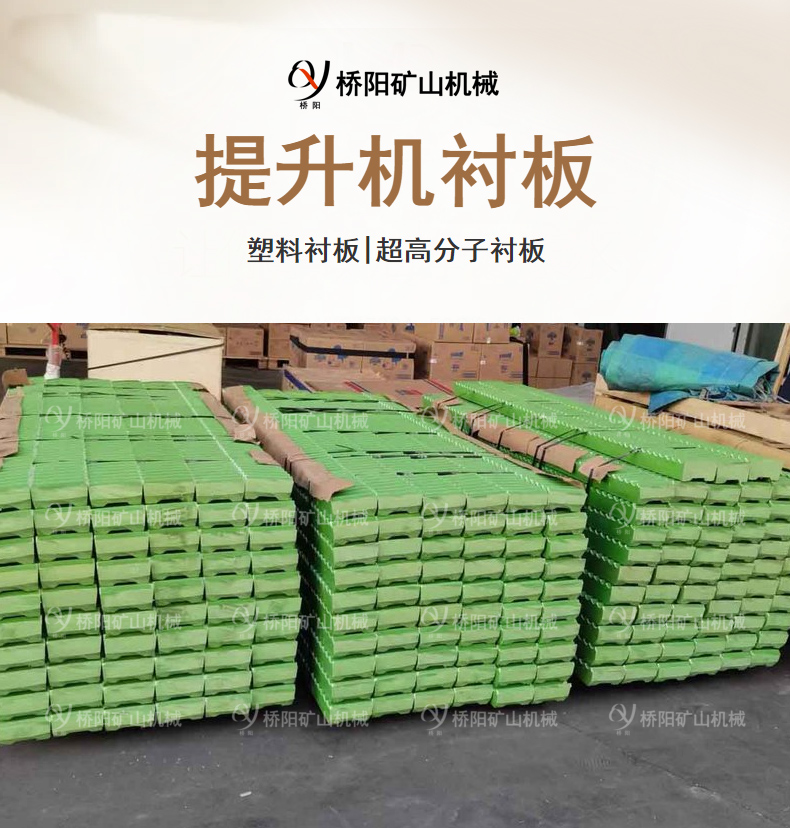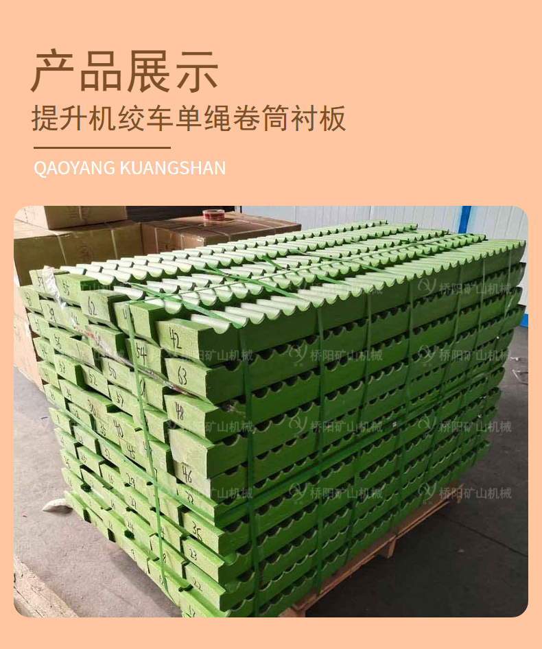 塑料衬板主要应用于煤炭、冶金等矿山用单绳缠绕式提升机主轴装置滚筒、提升绞车主轴装置滚筒,以及类似的、利用滚筒装置缠绕钢丝绳的机械上。