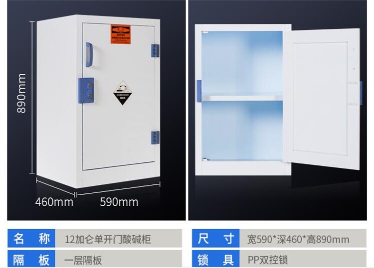 强酸碱储存柜具有耐强酸、强碱与抗腐蚀的特性。适用于实验室各类化学品及器皿的安全存储,强酸碱储存柜是个必要的选择。