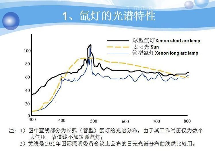 长弧氙灯:又叫管型氙灯,可做成单端、双端引出两种,长弧氙灯发出的光和太阳光光谱很接近,?其波长范围主要在