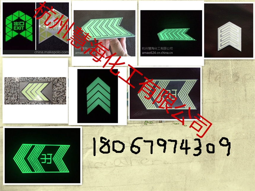 (2)蓄光材料采用高亮长余辉发光颜料,激发光强度要求低,任何光源都可作为激发光光源。即使在表面照度消失或者降低时,仍能蓄光自发光8小时以上。产品性能与特点