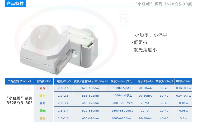 3528球头LED灯珠特性:小功率、发光角度小、小体积