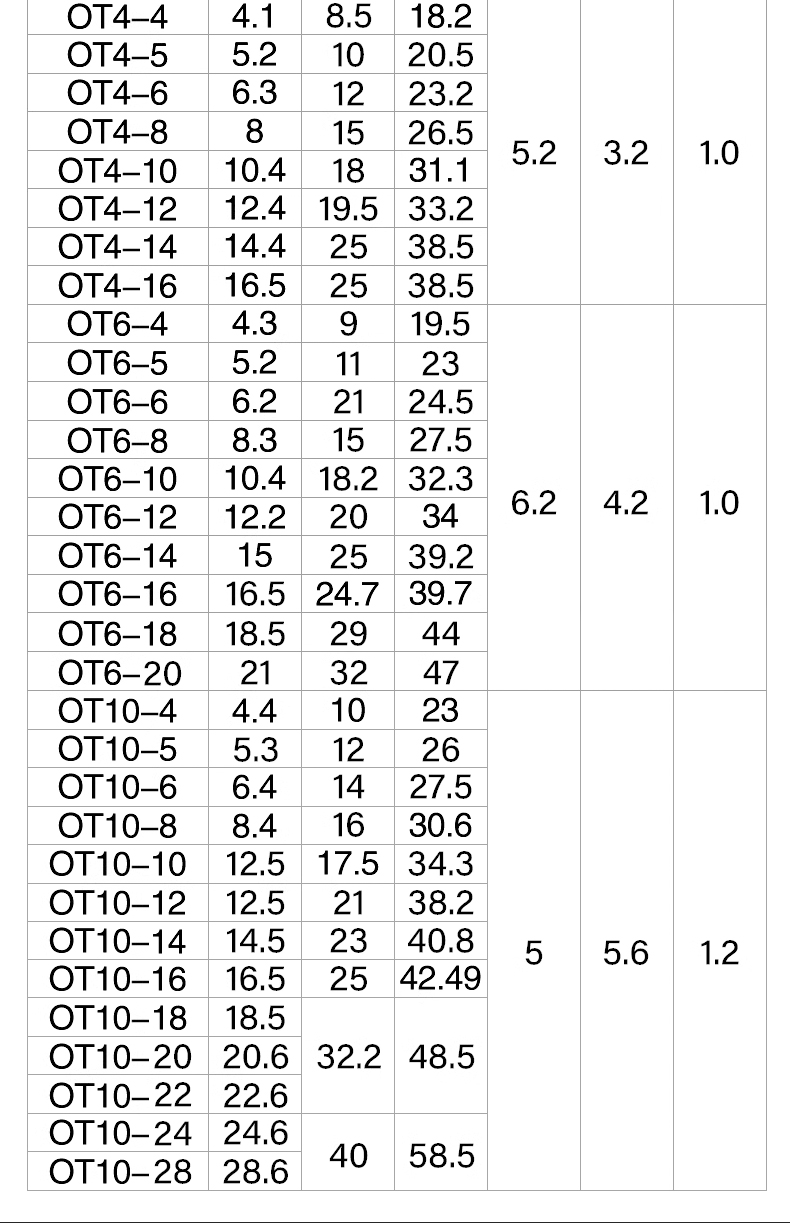 OT4/6/10/16/6-8-10-12-16-18-24-30圆型冷压接线端子0型线鼻子 型号 | OT6-30黄铜裸端子 | ||