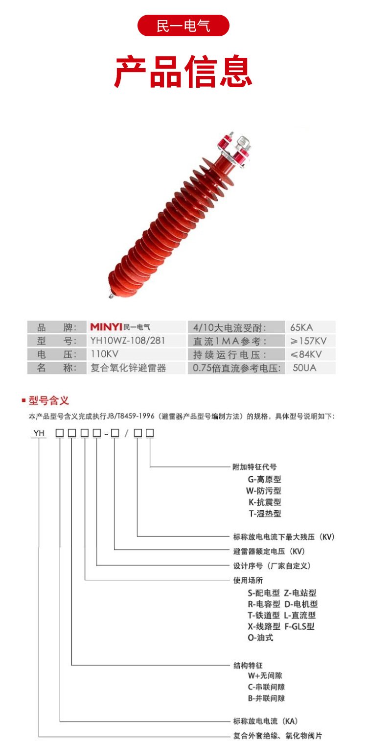 YH10WZ-108/281 110KV复合氧化锌避雷器 耐污性强 源头厂家供应 供货方式 | 厂家直供 | ||