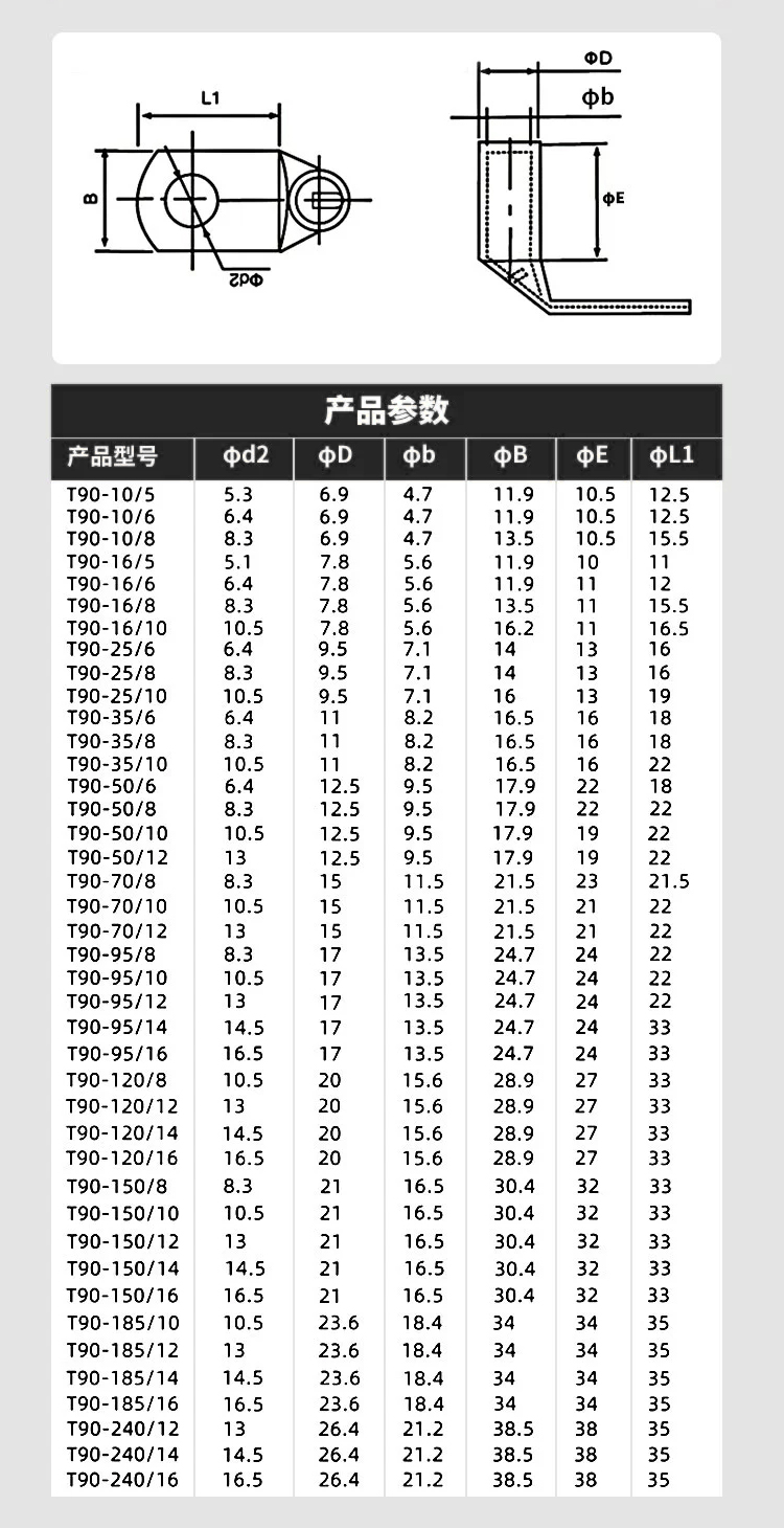 型号 | T90度系列铜管端子 | ||