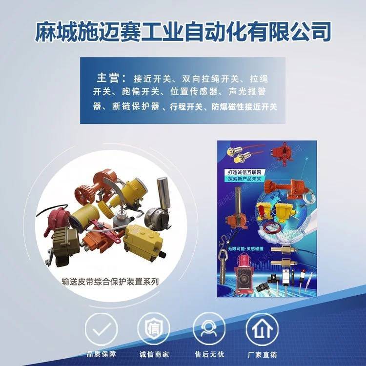 主营产品:接近开关、光电开关、两级跑偏开关、双向拉绳开关、霍尔开关、气缸磁性开关、防爆磁性接近开关、打滑开关、井筒开关、防撕裂开关、料位监测器、速度检测器、欠速开关、堆煤开关、煤流开关、倾斜开关、速度传感器、齿轮传感器、矿用电气、行程限位开关、皮带输送装置控制柜、矿用声光报警器、起重机配件、凸轮控制器、主令控制器、声光组合信号器等自动化工控。