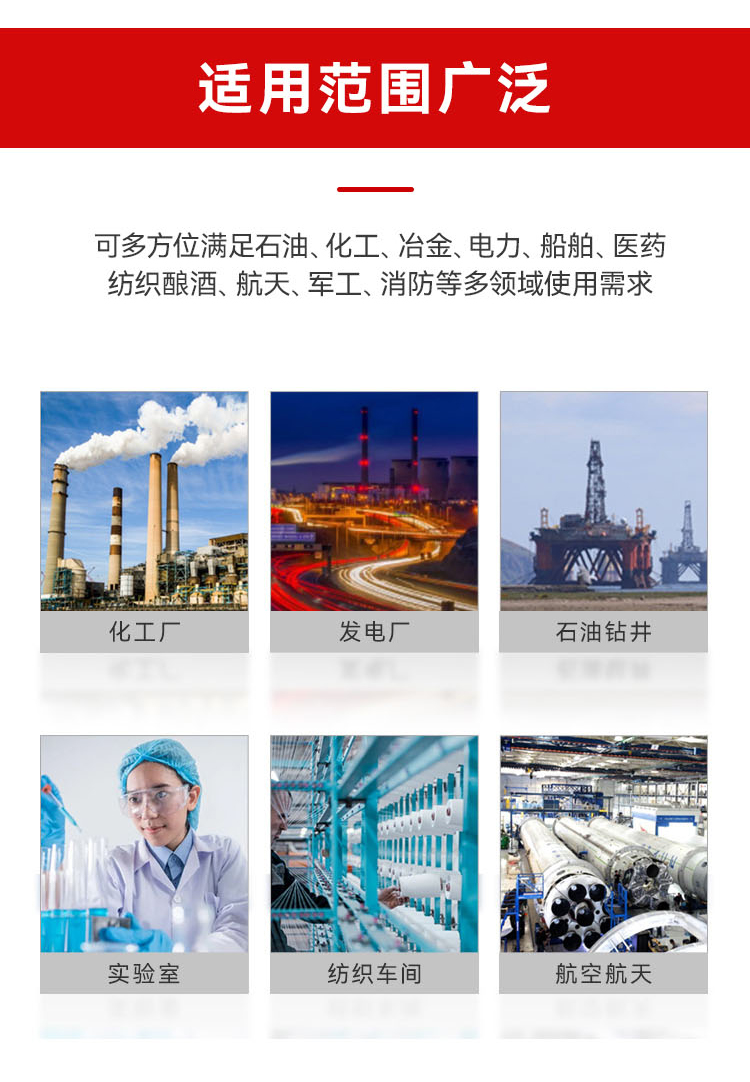 适用场景 | 化工、炼油、石油开采、天然气、医药、纺织、海洋石油平台、冶金、消防等爆炸性危险场所 | ||