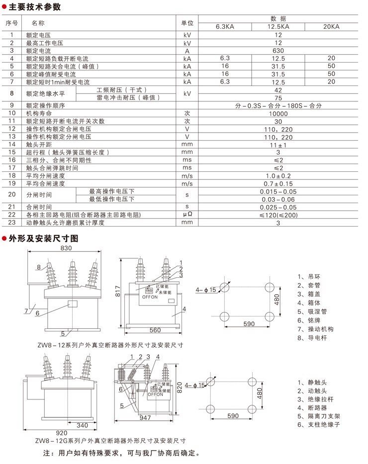 2.断路器可配置手动操作机构(只可进行手动分合闸操作)或者电动操作机构(既可手动操作,也可电动操作);