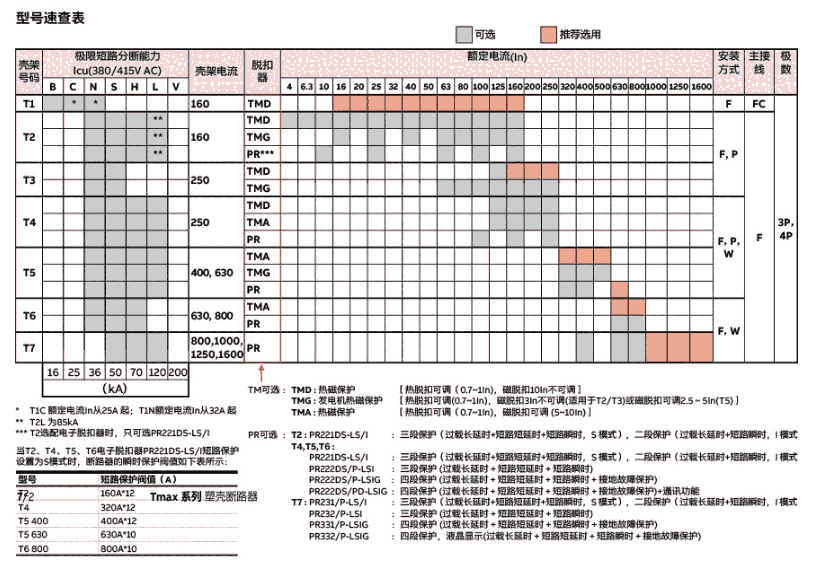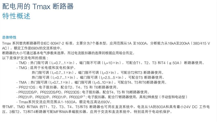 Tmax系列 配电用交流塑壳断路器,断路器是指能够关合、承载和开断正常回路条件下的电流并能在规定的时间内关合、承载和开断异常回路条件下的电流的开关装置。断路器按其使用范围分为高压断路器与低压断路器,高低压界线划分比较模糊,一般将3kV以上的称为高压电器。