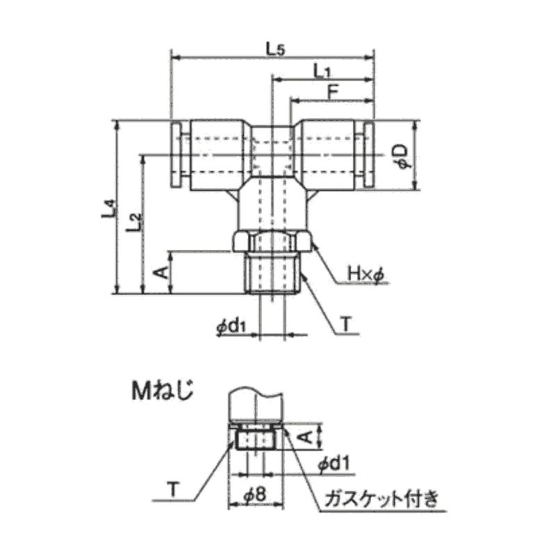形状ティー 使用流体空気 水 高使用圧力(MPa)1 使用温度範囲(℃)(空気)-20~+80、(水)0~+40