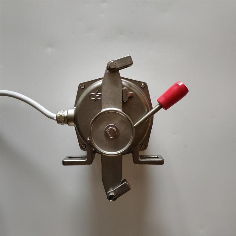 工作原理:当胶带运输机现场紧急事故时,在沿线任意位置牵动系在挂耳上的钢丝绳,迫使机内凸轮转动而驱动元件开关动作,发出停机信号,达到停机效果,防止事故的扩大。