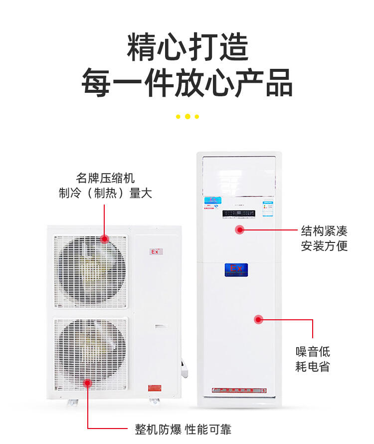 结构紧凑、外观优雅、设计轻巧、安装方便。采用名牌压缩机,制冷(制热)量大,性能稳定可靠,噪音低、耗电省,使用寿命长。采用复合型防爆型式及完善的过热、压力保护等措施,整机防爆,安全可靠。控制技术先进,温度高低、风量大小可调节