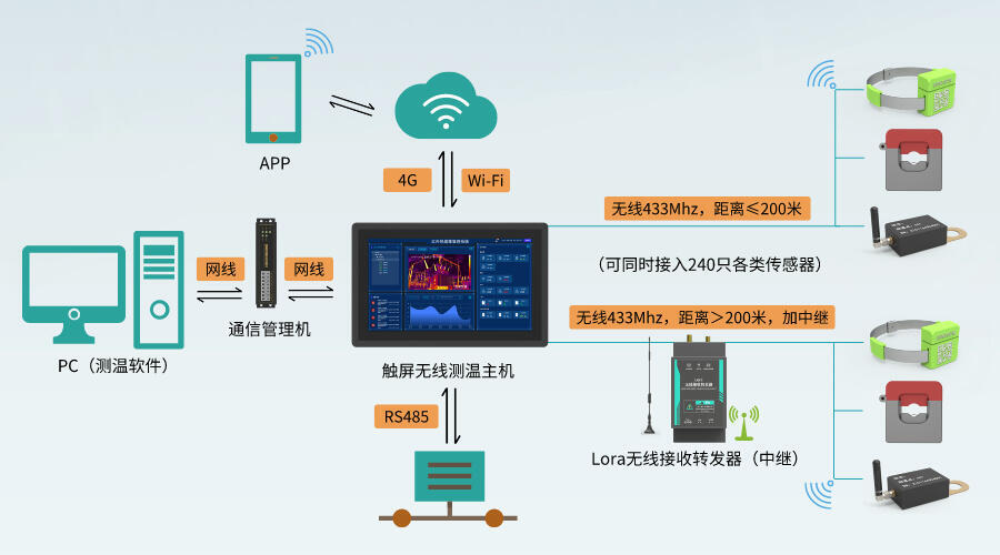 3、通信模块:测温主机一般分为无线通讯和有线通讯两种通信方式、通信模块把测温主机数据上传到企业通讯设备,实现远程查看。