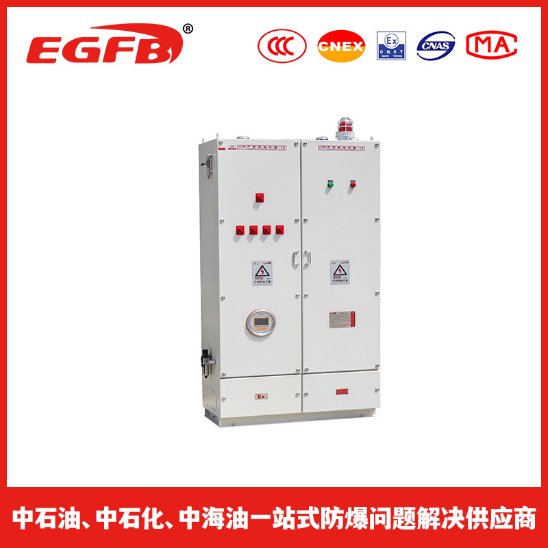 采用介质隔离点燃源的防爆措施。即:把用户所用的电器元件安装在一个充满正压洁净气体的柜体内,使外部环境中易燃易爆的混合性气体无法接触到电器元件在正常工作时所产生的电火花或危险温度,从而达到电器防爆的目的。