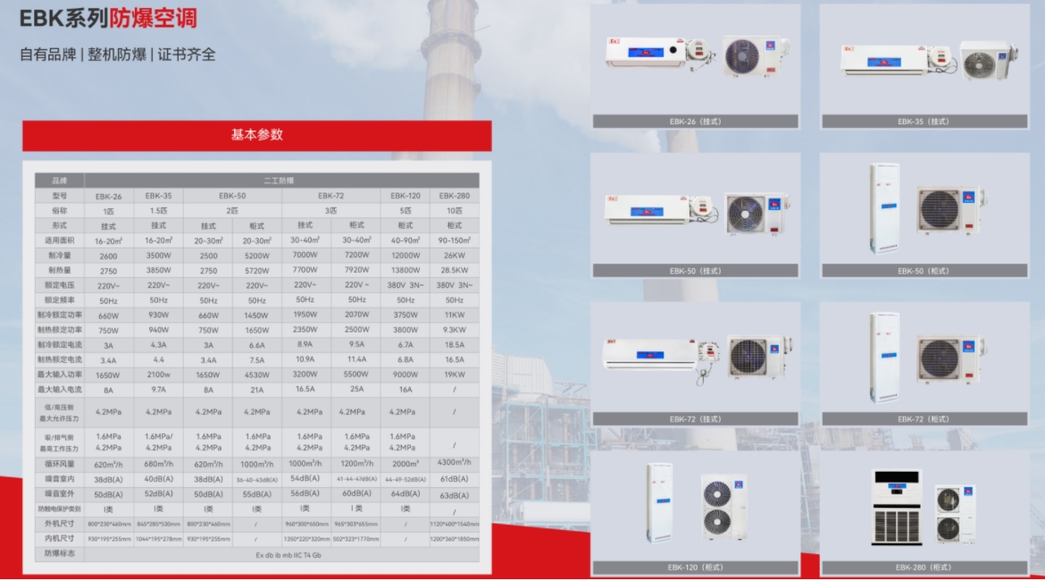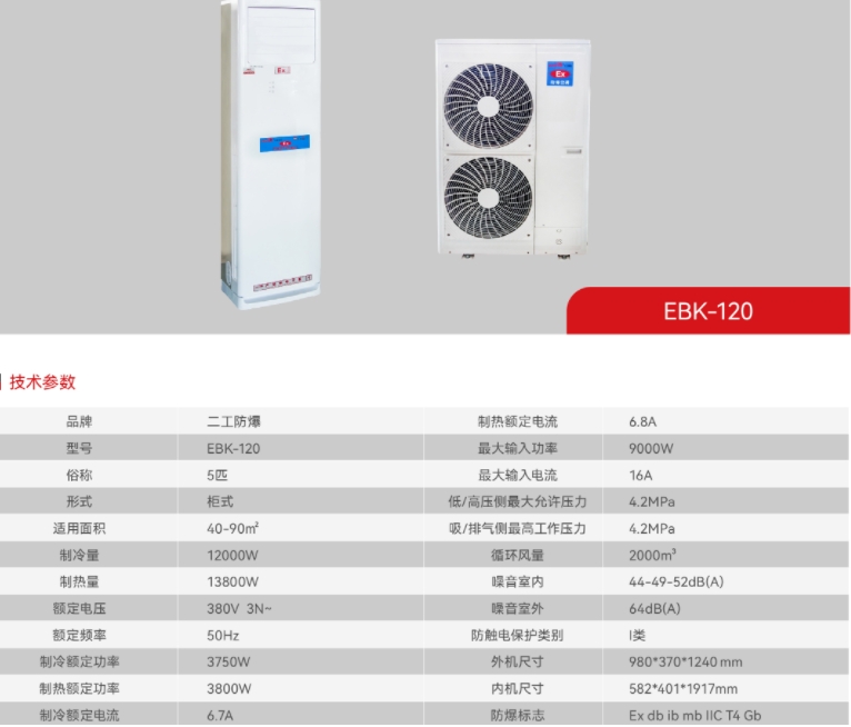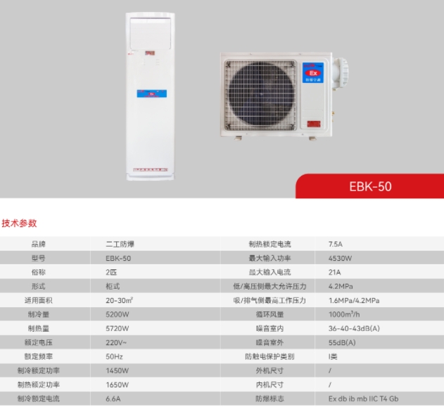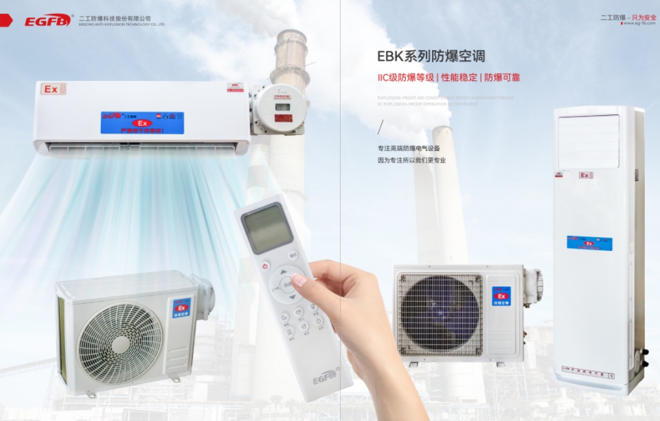 产品具有制冷制热和自动除霜功能,压缩机、风机等都经过特殊的防爆处理,防爆类型为整机防爆。防爆产品可应用于石油、化工、医药、科研、军事、危险仓库等易燃易爆的混合性气体环境中使用。在结构上采用隔爆型、本安型、浇封型等复合防爆技术,控制端全由本安型控制,不产生任何电火花,使用方便安全,采用高效多翅式换热器,冷煤通过时与空气的接触更充分,能大幅度的提高空调的制冷制热效果,手动控制和遥控两种。防爆空调未取得生产许可证不得生产及销售。