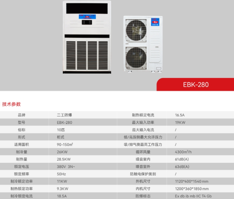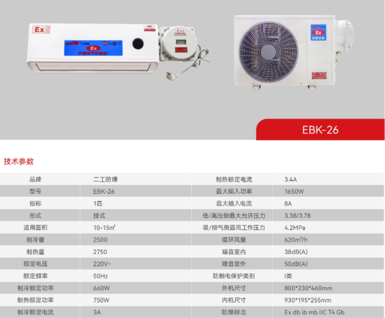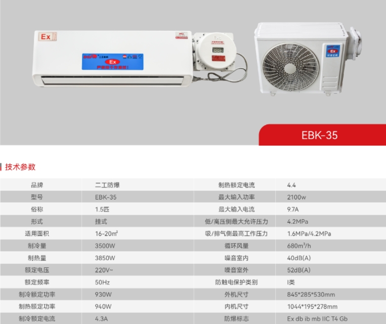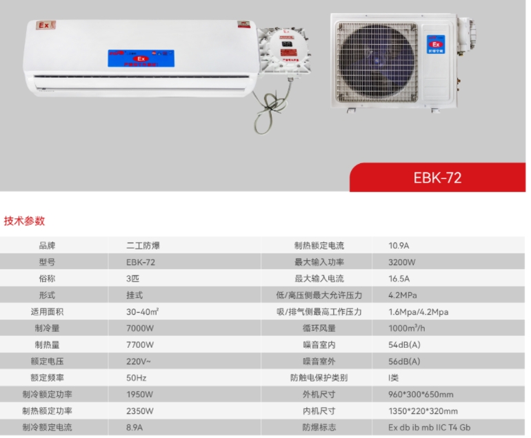 结构紧凑、外观优雅、设计轻巧、安装方便。采用名牌压缩机,制冷(制热)量大,性能稳定可靠,噪音低、耗电省,使用寿命长。采用复合型防爆型式及完善的过热、压力保护等措施,整机防爆,安全可靠。控制技术先进,温度高低、风量大小可调节。