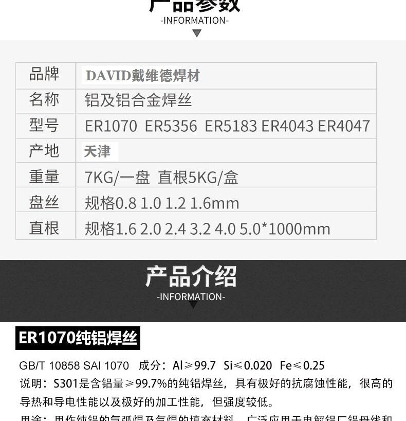 用途:用作除铝镁合金以外的铝合金工件和铸件的氩弧焊及气焊时的填充材料。常用于6061等600系列铝合金、3000系和2000系列铝合金及铸铝的焊接。广泛用于铁路机车、化工、食品等行业。