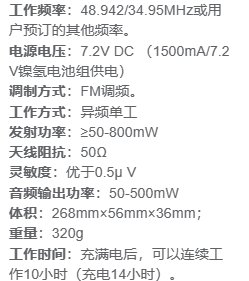 工作频率 | 48.942/34.95MHz或用户预订的其他频率 | ||