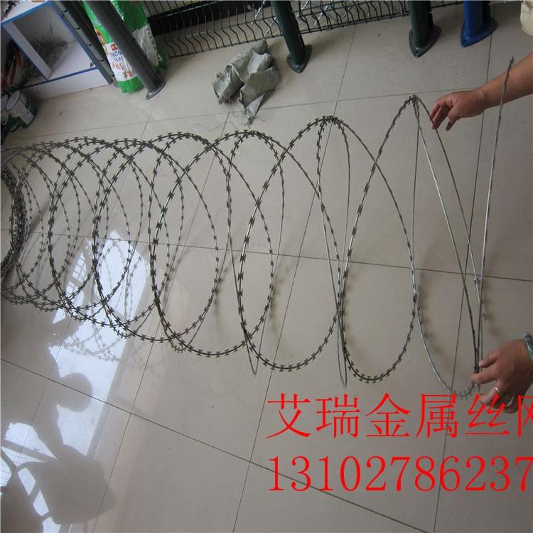 刺丝滚笼-刀片刺网-螺旋刀片刺绳是冲剪钢板成锐利的尖刀带子,然后包裹中碳钢丝(筋丝)之上。刀片刺丝是从海外引进的绝对禁止通过的新型隔离产品。锋利的刀片刺丝由双根线扣卡子组装后成蛇腹状,让人看到不寒而粟,能够起到了恐吓作用,实际上人挨上刀片刺丝就被划破,实际效果明显。该产品施工便利快捷。深受喜好。各国已将刀片刺网广泛用于飞机场重地、边境线、、政府机关、银行,以及别墅的围墙、高速公路、铁路护栏等地。