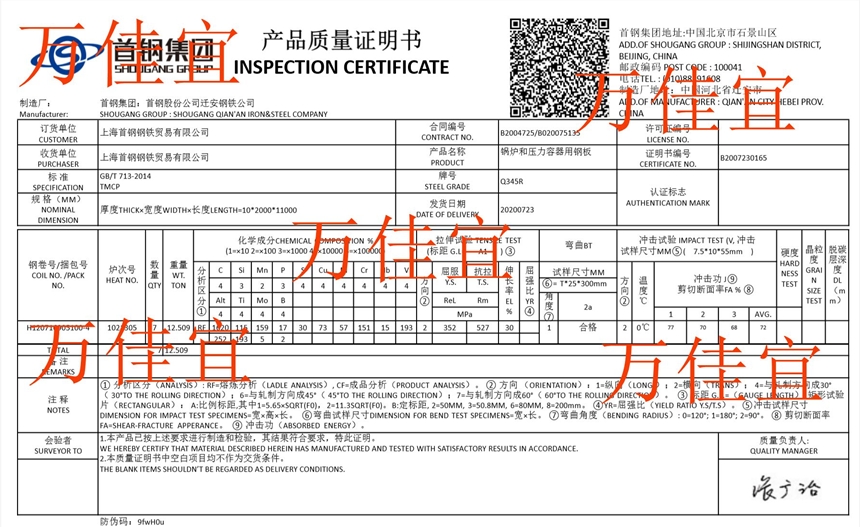 锅炉压力容器用钢板 材质书含扫码验证