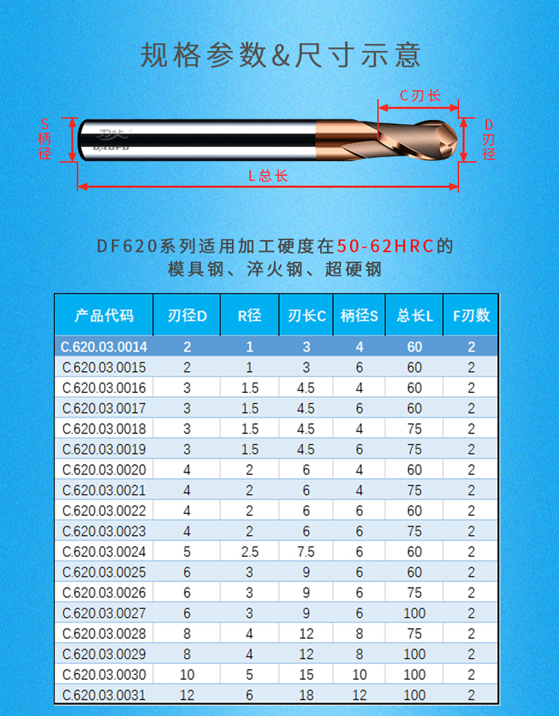 适用范围 | 50-62HRC模具淬火钢料 | ||