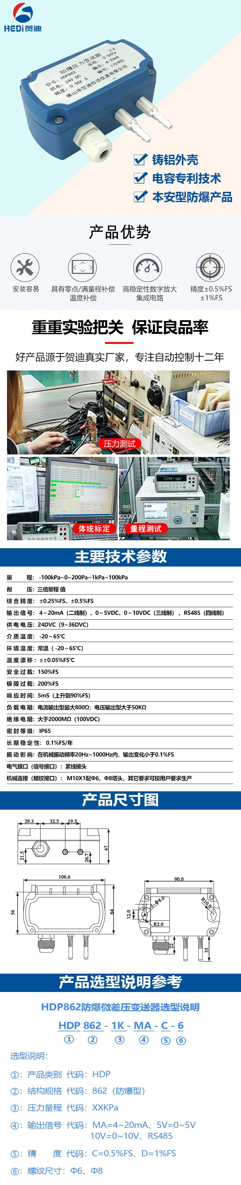 贺迪HDP862防爆微差变送器输出4~20mA供电24V
