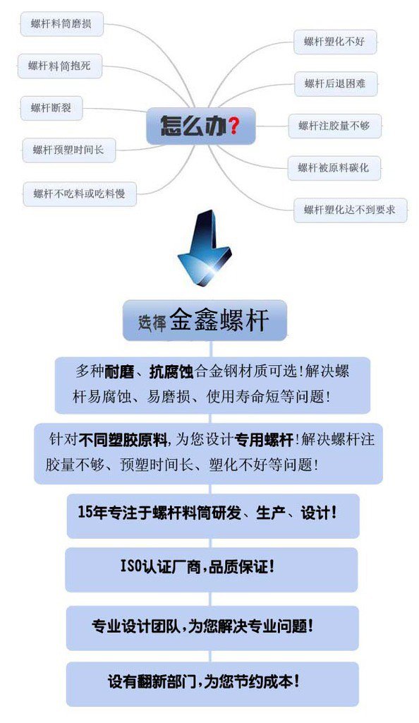 ? ? ? ?金鑫螺杆公司1999年9月在深圳成立以来,一直从事塑料注塑机螺杆、挤出机、吹塑机螺杆、等塑料机械的中心部件---注塑机螺杆料筒设计制造,为长期发展方向。