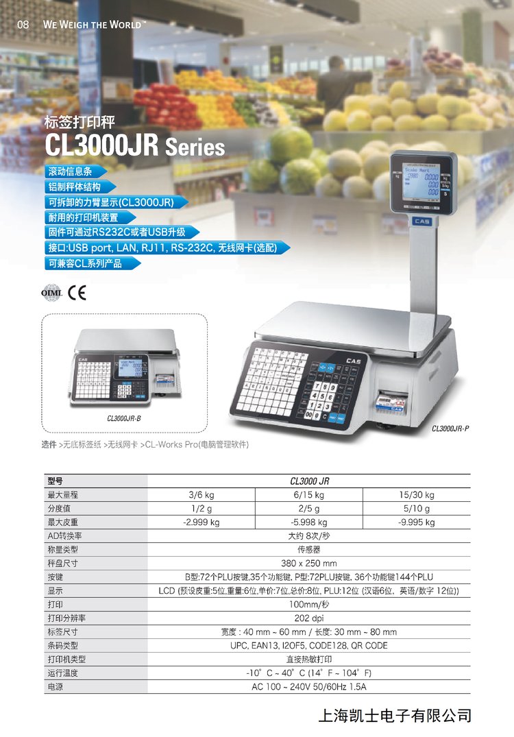 凯士公司的CL3000系列条码打印计价秤经过多年生产研发和市场广泛应用,目前已具备了大型卖场、超市、便利店、水果店、熟食店等各种场合所需要的各种功能,联网速度快,标签格式多样化,适宜于各类商家使用,欢迎联络咨询~
