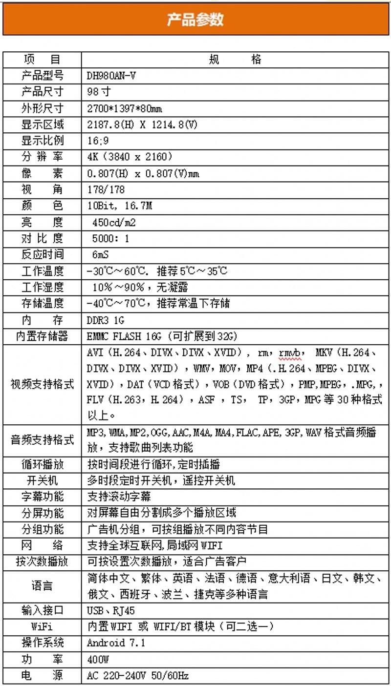 u 功能齐全:支持横竖屏播放,视频分屏,滚动字幕,定时开关,USB数据导入等功能。