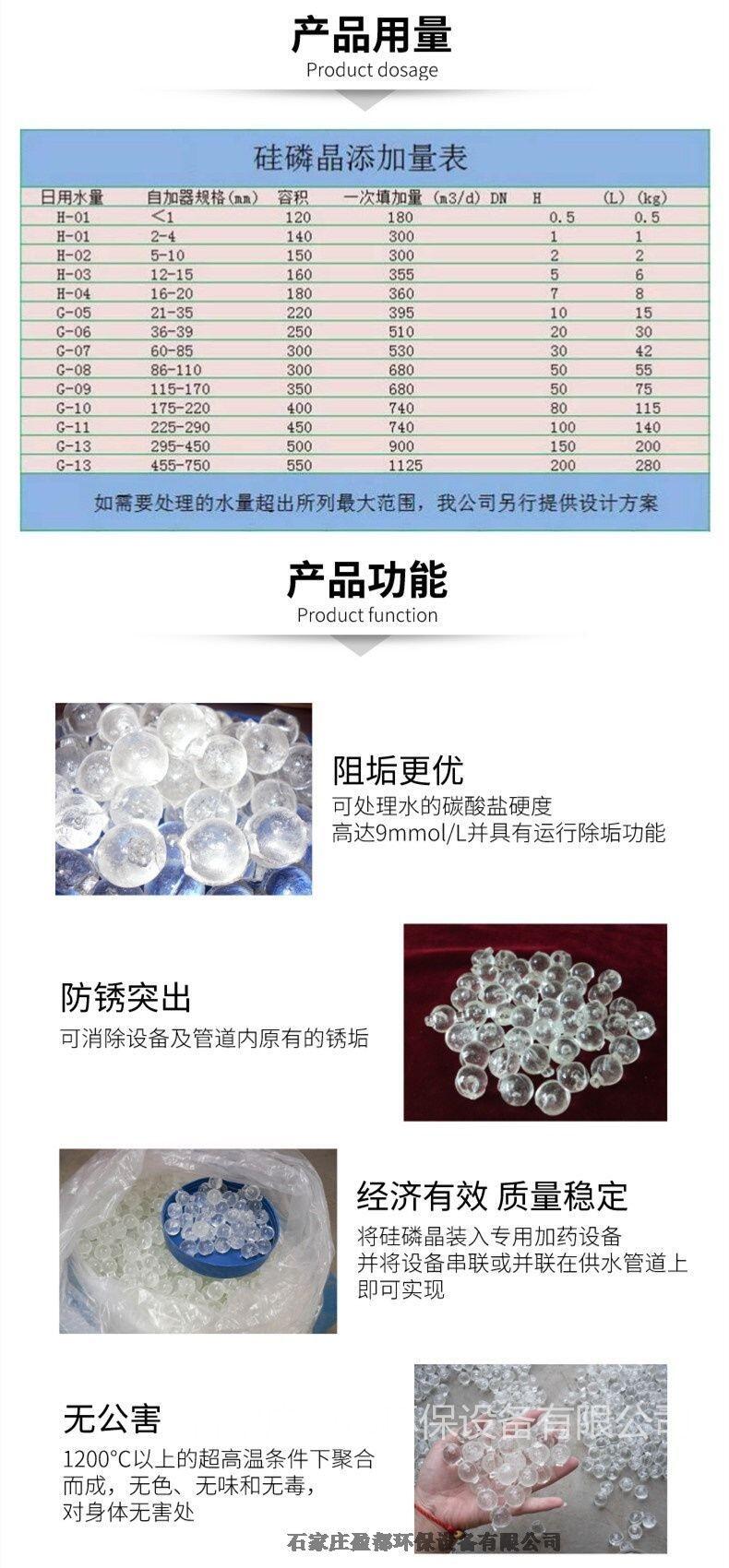 硅磷晶是玻璃状的小球,是聚磷酸盐/硅酸盐组成的微溶性聚合体。在水中聚磷酸盐能防止CaCO3的晶体生长和凝聚,并对铁离子起封闭作用,对氢氧化铁起分散作用。硅酸盐和聚磷酸盐更能使管道内表面形成保护膜,隔绝溶解氧,防止金属腐蚀。长期使用还可以清系统中原有的氧化铁垢,而黏附在它表面的碳酸盐类也可脱落。硅磷晶使用方便,不需维护、不耗动力,水头压力损失极小。用户要做的,仅是每隔3~6个月补充一次药剂即可。归丽晶在每吨水中只需1~3克,就可满足预期。