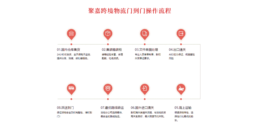 上海聚嘉国际货运代理有限公司-聚嘉跨境物流是一家综合性物流服务公司,具有完善的全球性运输网络,聚嘉跨境物流以香港、深圳、上海地区为依托,收货面覆盖华南、华东、华中地区。 专门提供大陆至欧美、非洲、澳洲、南美等全境海运、空运到门服务、整柜托运,所有单证、商检、报关、清关派送等服务!公司以服务宗旨,让客户的物流成本廉价化,为客户争取更大的利润!以安全、快捷的经营理念,立志成为廉价货运倡导者!