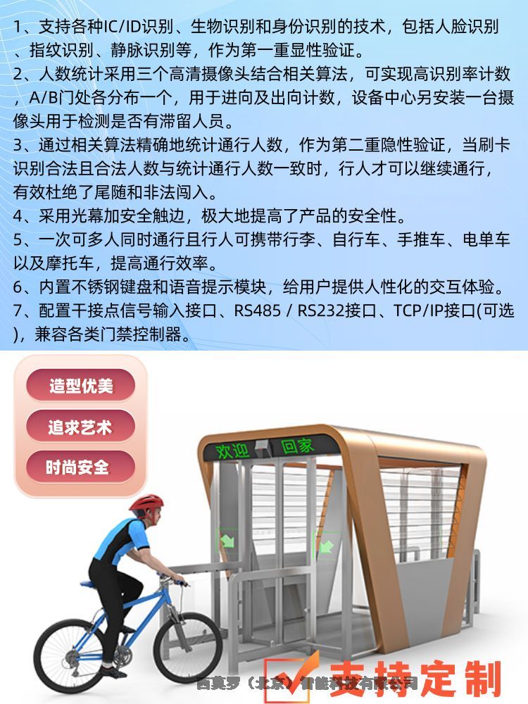 携带访客功能:用户携带亲友通行AB门系统,可在通过系统第一道门后,刷卡并在键盘上输入用户携带的人数。当输入的人数与系统识别的未刷卡人数相吻合,则系统打开第二道门,行人可以正常通行。