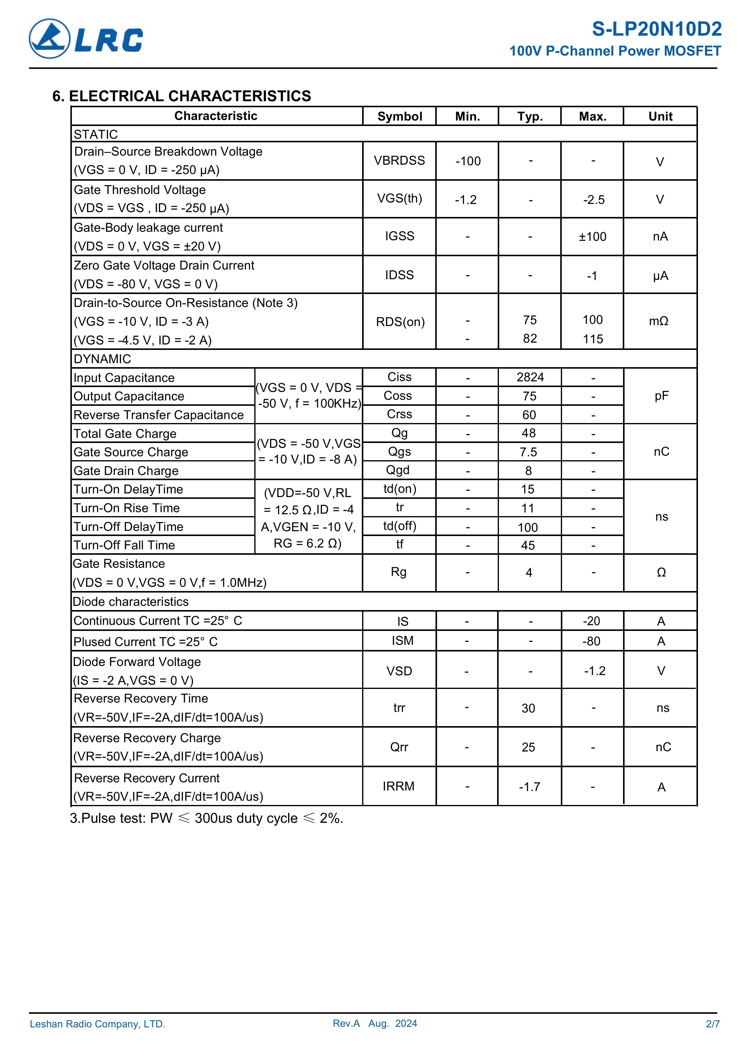 LRC/乐山无线电 S-LP20N10D2 全新原厂原装中低压高频功率控制电子开关管,车规级P型沟道场效应管-100V、-20A、75mΩ、P-Channel、贴片式中低压MOSFET:S-LP20N10D2/P20N10D2。Vds电压:-100V;Id电流:-20A;Rds(on)内阻:75mΩ;封装方式:TO-252-2L;最小包装数量:2500pcs/盘-编带。