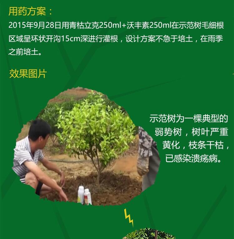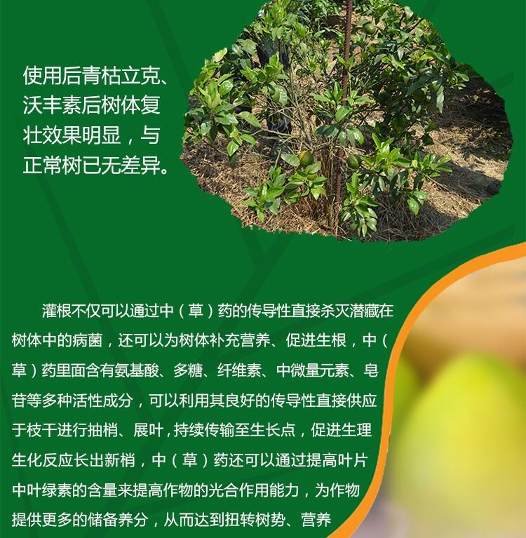 在树冠投影处挖环状沟使用青枯立克200-300倍+地力旺300倍+沃丰素300倍兑水进行灌根,重点灌透毛细根区。灌根药液向下引导根系生长、杀灭病菌,向上供给养分。
