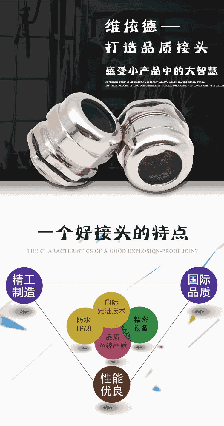 產品說明 :本公司的不锈钢电缆接头采用304不锈钢材质精制而成,具有独特的防爆功能,特殊夹紧爪与夹紧圈之设计,夹紧电缆范围大,抗拉力特强,可防水、防尘、抗盐、耐弱酸、酒精、油、油脂及一般溶剂。防爆作用广泛被使用在防爆电器,中石化,化工等行业,不锈钢电缆接头防爆认证齐全。