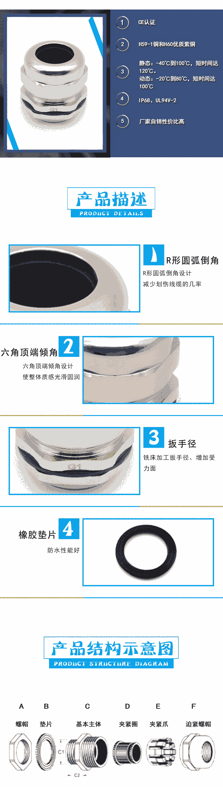 产品材質 :A.C.F 部份以不锈钢製304制成,E 部份以 UL 認可之尼龍 PA66 製成 ( 防火等級 UL 94V-2 ),B 及 D 部份採用EPDM耐候橡膠製成。
