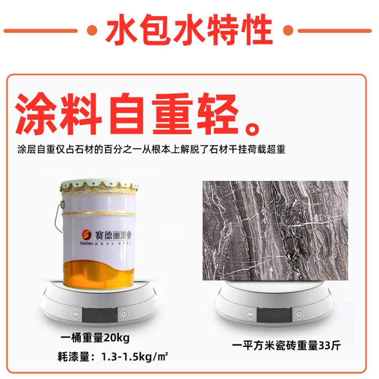 多彩漆, 又名液态花岗岩漆(水包水/水包沙多彩系列),是为不断发展的建筑外墙设计而生。花岗岩、大理石以其庄重的质感、耐久的品质、多样的色彩受到大家的青睐。但花岗岩、大理石的缺点也显而易见:昂贵价格、施工复杂、自重高。水性多彩漆通过微胶化造粒,能展现花岗石的效果。色彩、耐久,可按设计师提供的花岗岩样品定制,程度可,是替代外墙花岗岩的产品。