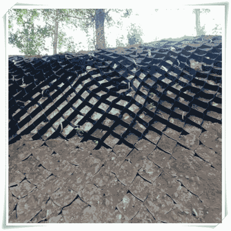 土工格室翻开后铺设在边坡斜坡上,将其固定住后,填土种草。而且片材上打孔的,还能增加土体的排水功用,再参与植物根系的效果,使其加固护坡、美化护坡的效果尤为出色。