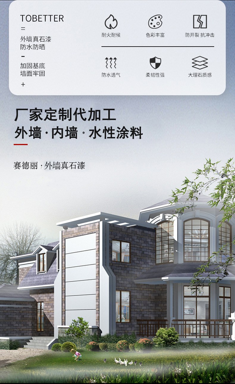 真石漆的弹性,也就是说弹性越大的产品,大家的墙面涂刷完毕,就越不容易裂缝。