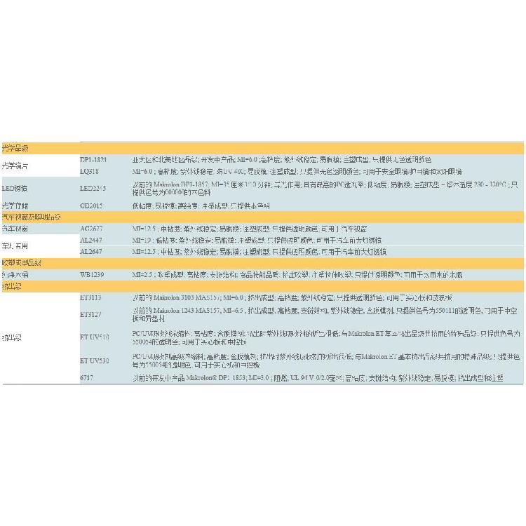 机能:1,高温2,光学机能3,减轻重量 削减质量4,加强流量5,差别化,无油漆款式选项6,概况7,尺寸稳固性8,反射率9,耐化学性潜伏:1,前大灯镜片,挡板,反射镜,内镜,外壳,薄壁镜片和光管。