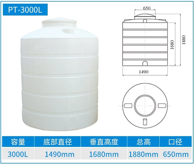 我公司生产的3吨塑料桶采用进口PE塑料原料和纯熟的滚塑工艺,整体加工一次成型,生产各种滚塑系列产品。主要产品有塑料PE蓄水箱、化工储罐、槽、加药箱、溶盐箱、食品周转桶、等等。并且可以根据客户的要求批量加工各种滚塑产品。