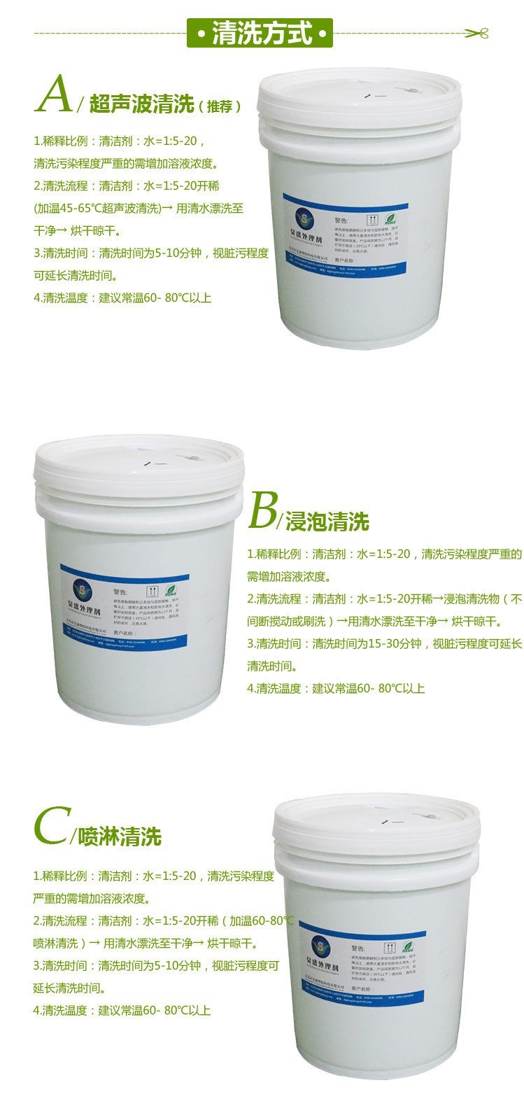 清洗方式 | 超声波、喷淋、浸泡 | ||