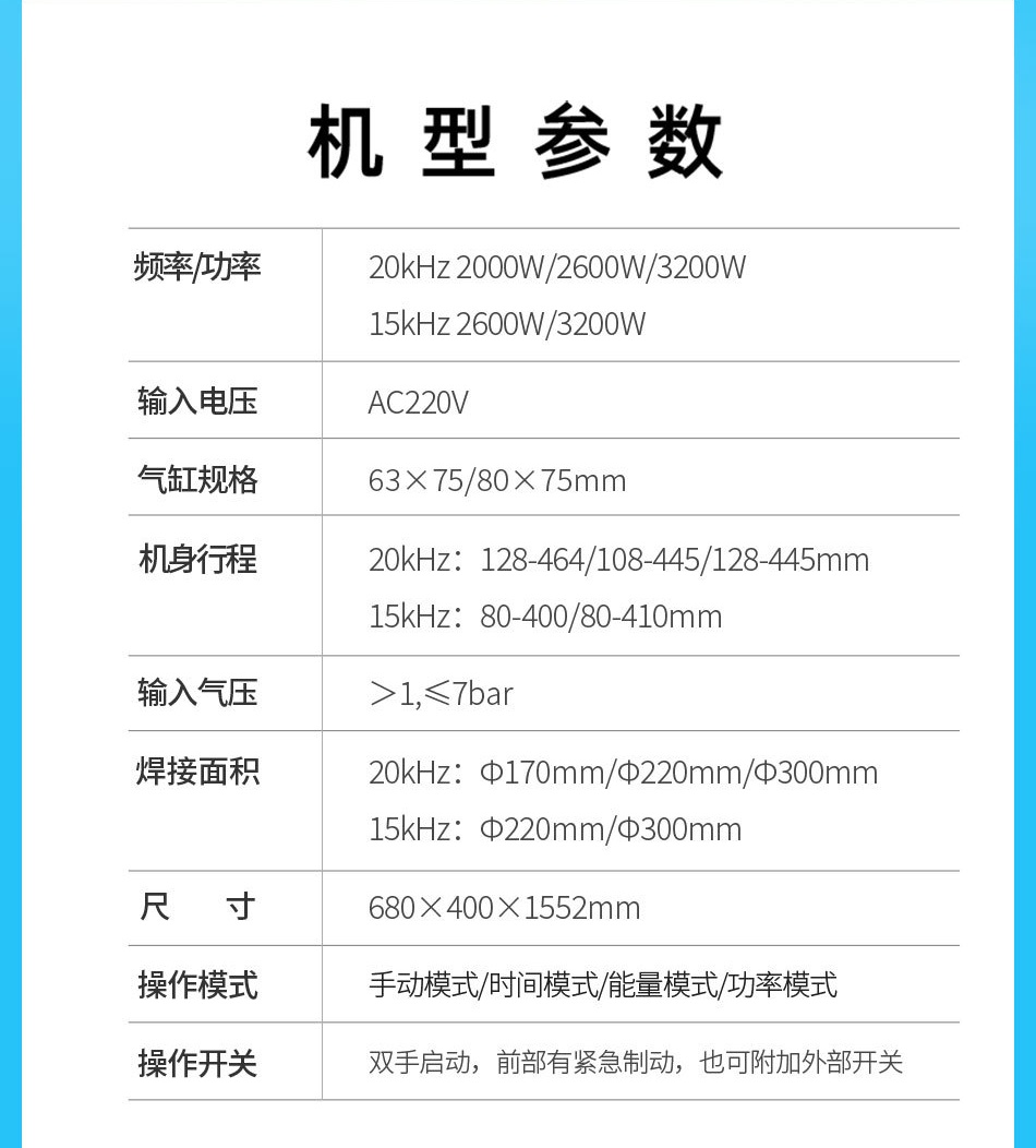 焊接面积 | 20kHz | Φ170mm/Φ220mm/Φ300mm | |