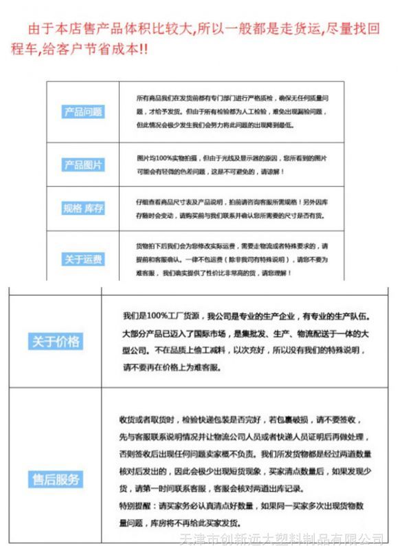 天津市创新远大塑料制品有限公司 智能客服智能客服在线解答,若涉及资金打款事宜,务必与厂家进行电话确认。